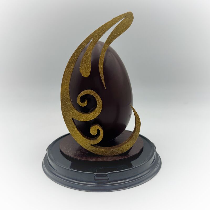 Oeuf design composé d'une coque de chocolat de couverture Casa Rivera del Cacao 70% Médaille d'Or, garni d'un mélange de chocolats.