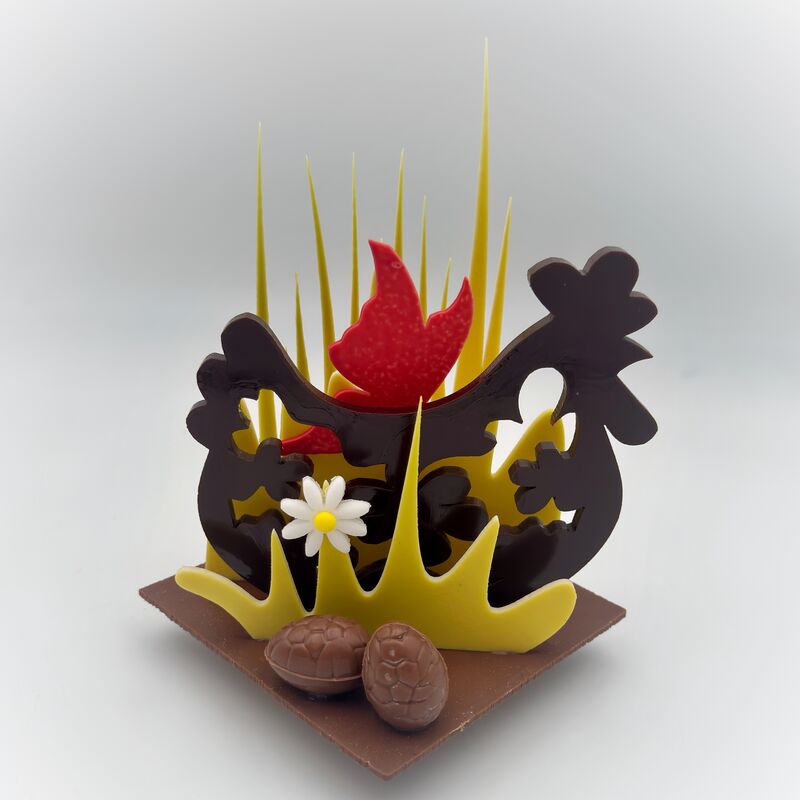 Montage en chocolat lait et noir avec des petits oeufs praliné.