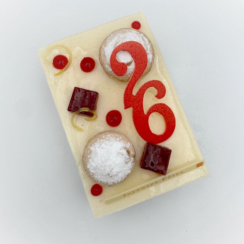 Biscuit moelleux et croustillant au yuzu, crémeux framboise, génoise imbibée yuzu et bavaroise à la vanille.