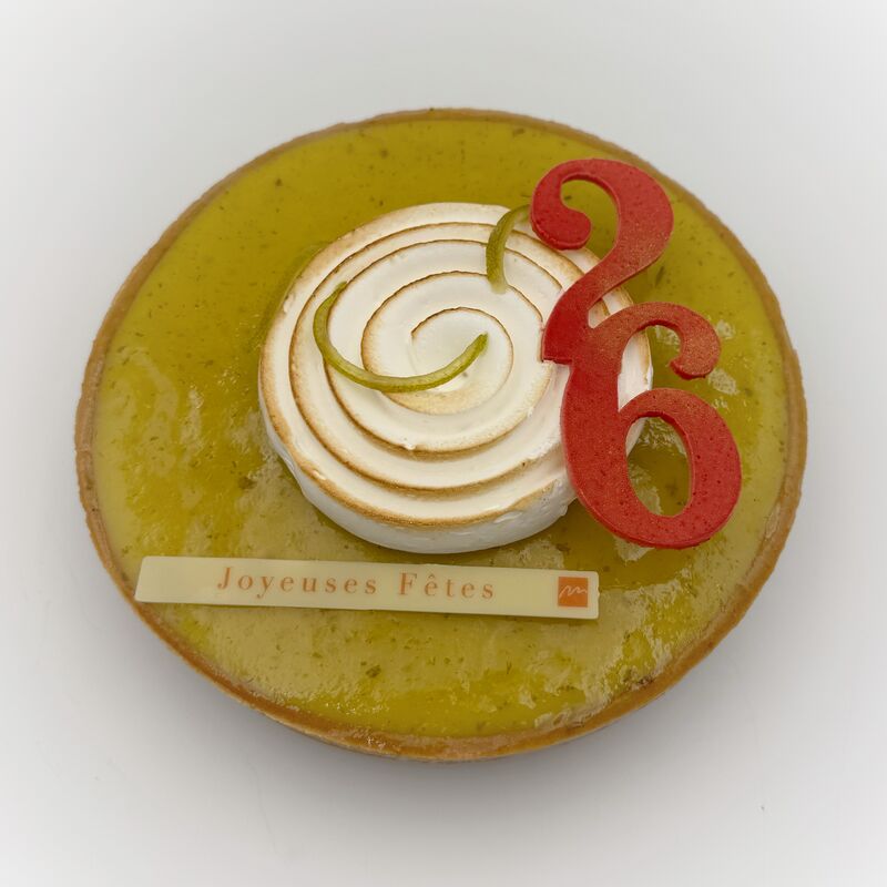 Fond de pâte sucrée, crème d'amandes, crémeux citron vert et basilic et meringue italienne