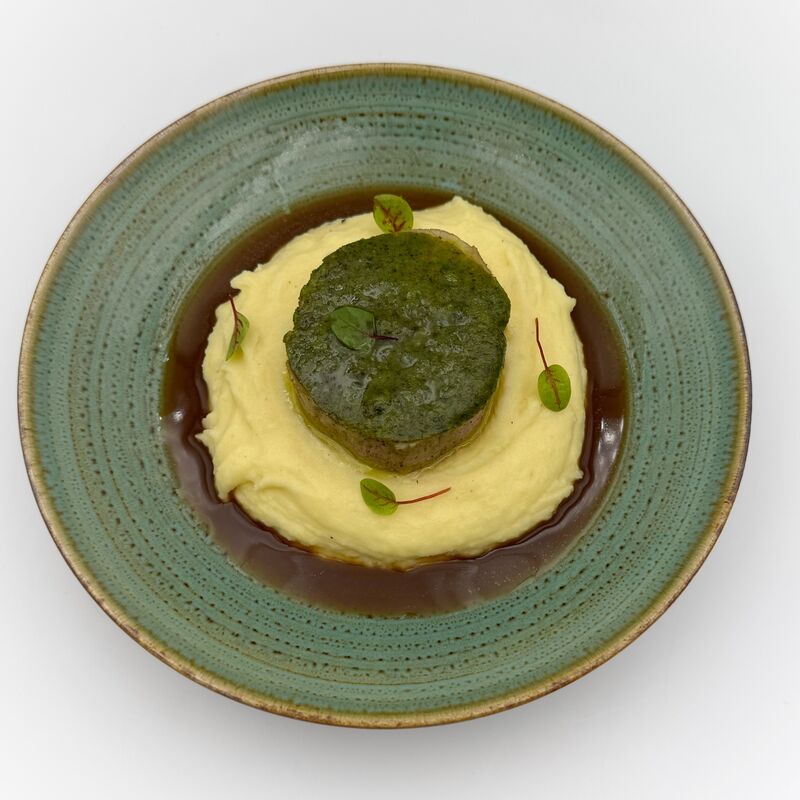 Grenadin de veau en croûte d'herbes, purée de pomme de terre et panais à la vanille avec une sauce brune crémée.