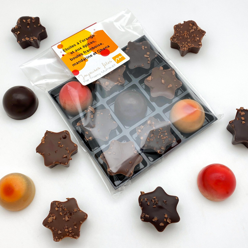 Bonbons chocolat Etoiles ganache épices et orange, boules framboise, mandarine et Ghana.