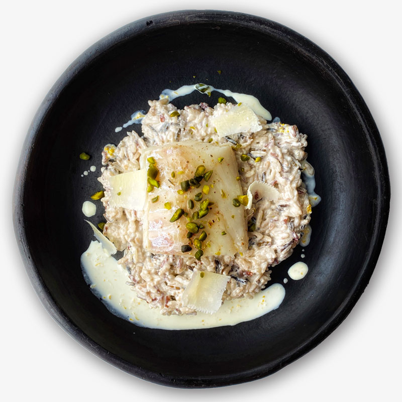Ingrédients : cabillaud, riz, échalotes, beurre, vin blanc (sulfites) huile d’olive, crème, beurre, Mascarpone, Parmesan, pistache, yuzu, citron, fleur de sel, poivre.