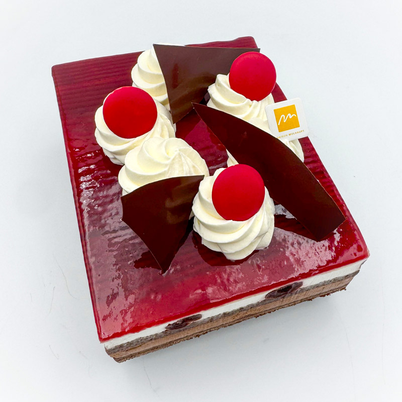 Génoise au chocolat, chantilly au chocolat Vega 64%, chantilly au kirsch et cerises au kirsch.