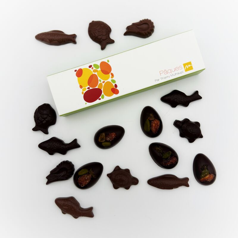Ingrédients : amandes, poudre de lait, sucre, fêves de cacao, beurre de cacao, et un soupçon de lécithine de tournesol (émulsifiant)