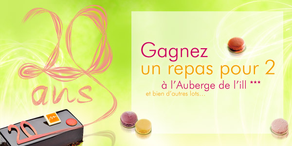 Jeu concours disponible dans toutes les boutiques Thierry Mulhaupt du 5 avril au 15 juin 2011. Tirage au sort à partir du 17 juin 2011. Règlement jeu concours 20 ans.